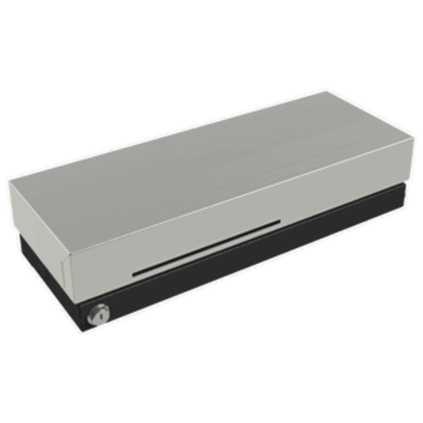 • cash drawer, top opening, 460x100x172mm, 6 note compartments (vertical), 8 coin compartments, 1 receipt compartment, 2-pos. lock, same locking, incl.: cable (RJ11, 3 m), lid, colour: black
