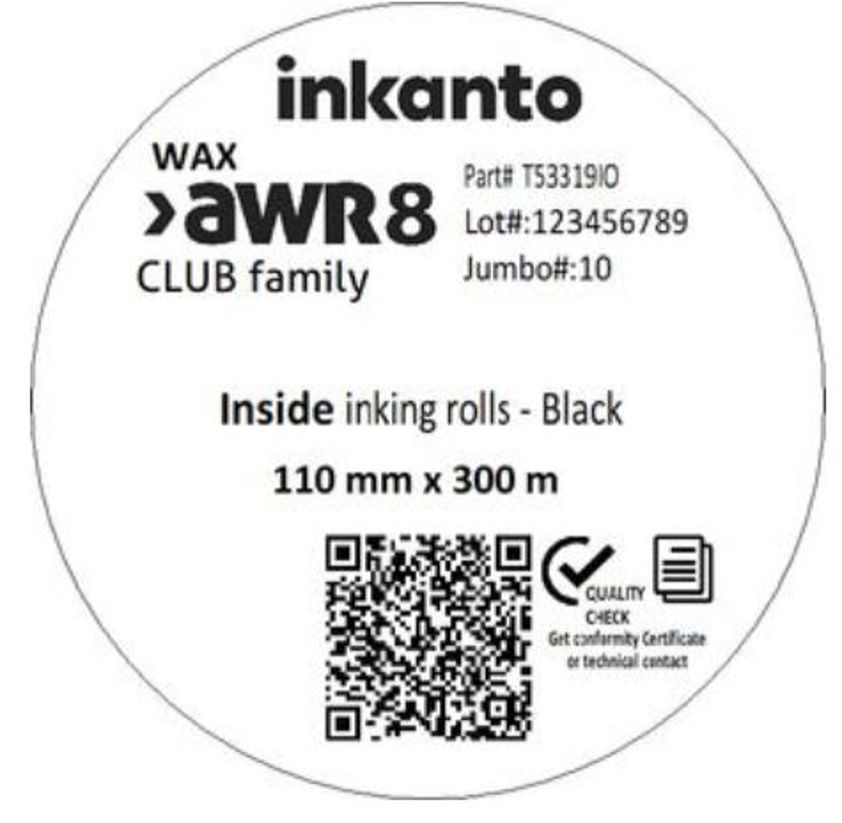 Thermal transfer ribbon, Inkanto, AWR 8, Wax, Roll-width: 110 mm, Core-width: 110 mm, Core: 25.4 mm, Length: 300 m, Ink side: Inside, Printhead: Flat-Head, Colour: Black