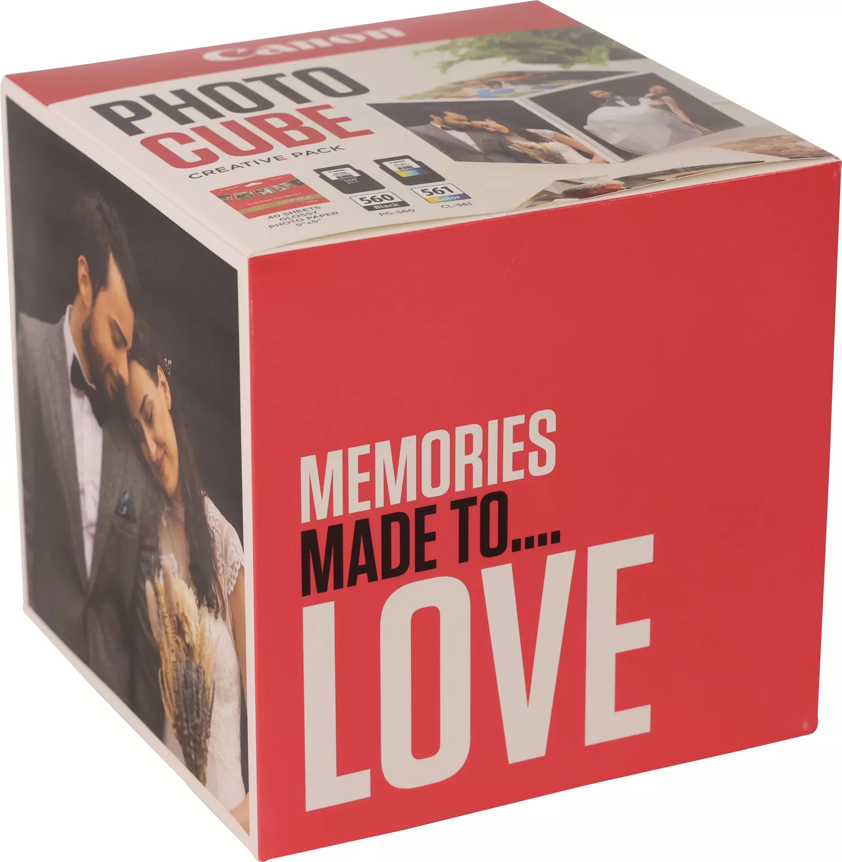 - The Photo Cube is a great way to store and display your favourite photos. Small enough to place around your home, you can store your most precious photos inside the box, display the photos on the outside of your box or gift the box to family and friends. You can also use the supplied double-sided tape to decorate the box. The box measures 14 x 14 x 14 cm (approximate), which allows for plenty of space for printed images. The square format is great for social media format printing, making this a great choice for family and friends. This pack is supplied with Genuine Canon PG-560 Black Ink Cartridges, CL-561 C/M/Y Colour Ink Cartridges and 40 5x5” (13 x 13 cm) sheets of square Photo Paper Plus Glossy II, allowing you to get more creative with your printing