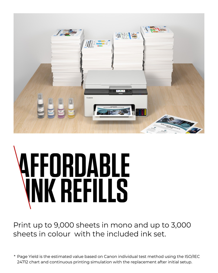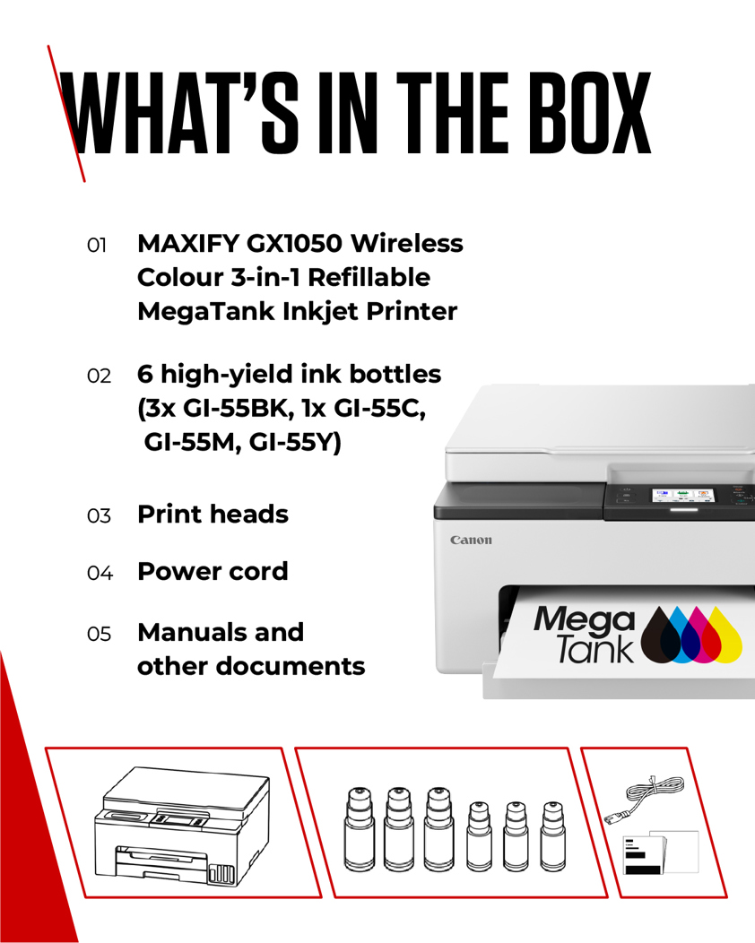 • Produce durable business-quality documents in your home with this full front operation multifunction MegaTank printer. MAXIFY GX1050 fits easily in any space due to its compact and user-friendly design. Benefit from fast print speeds and high yields thanks to its four individually refillable ink tanks and affordable ink bottle replacements.