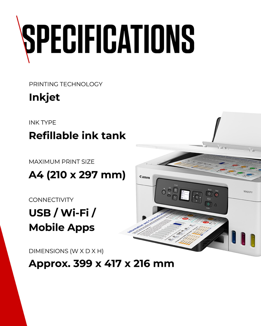 Print large volumes of high-quality business documents while making huge savings on CPP and TCO with this refillable and easy to use 3-in-1 MegaTank-equipped MAXIFY GX printer.