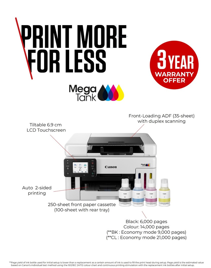 Features Product colour Black, White Scanning Colour scanning Faxing No Copying Colour copying Print technology Inkjet Printing Colour printing Control type Touch Market positioning Business Duplex printing Yes Duplex copying Yes Number of print cartridges 4 Maximum duty cycle 45000 pages per month Duplex functions Copy, Print Printing colours Black, Cyan, Magenta, Yellow Performance Scanning Colour scanning Faxing No Number of print cartridges 4 Maximum duty cycle 45000 pages per month Duplex functions Copy, Print Printing colours Black, Cyan, Magenta, Yellow Copying Colour copying Product colour Black, White Print technology Inkjet Printing Colour printing Market positioning Business Print quality Scanning Colour scanning Faxing No Maximum resolution 600 x 1200 DPI Maximum duty cycle 45000 pages per month Duplex functions Copy, Print Copying Colour copying Print technology Inkjet Printing Colour printing Input capacity Auto document feeder (ADF) input capacity 50 sheets Display Colour display Yes Display diagonal 6.86 cm (2.7") Display LCD Built-in display Yes Printing Print speed (ISO/IEC 24734) mono 24 ipm Print speed (ISO/IEC 24734) colour 15.5 ipm Maximum resolution 600 x 1200 DPI Time to first page (colour, normal) 8 s Time to first page (black, normal) 7 s Print technology Inkjet Printing Colour printing Duplex printing Yes Copying N-in-1 copy function Yes ID-card copy function Yes Edge erase function Yes N-in-1 copy function (N=) 2, 4 Maximum number of copies 99 copies Copying Colour copying Copier resize 25 - 400% Duplex copying Yes Scanning Scanning Colour scanning Optical scanning resolution 1200 x 1200 DPI Maximum scan area 216 x 356 mm Scanner type Flatbed & ADF scanner Input colour depth 16 bit Output colour depth 8 bit Scan technology CIS Output greyscale depth 8 bit Input greyscale depth 16 bit Fax Faxing No Input & output capacity Total number of input trays 1 Total input capacity 350 sheets Auto document feeder (ADF) input capacity 50 sheets Auto document feeder (ADF) Yes Print technology Number of print cartridges 4 Printing colours Black, Cyan, Magenta, Yellow Paper handling Maximum ISO A-series paper size A4 Maximum print size 216 x 1200 mm ISO A-series sizes (A0...A9) A4, A5, A6 ISO B-series sizes (B0...B9) B5 Non-ISO print media sizes Legal, Letter Envelopes sizes C5, Com-10, DL, Monarch Photo paper sizes 10x15,13x18,18x25,20x25 Paper tray media types Card stock, Envelopes, Photo paper, Plain paper Paper tray media weight 64 - 105 g/m² Ports & interfaces USB port Yes USB connector USB Type-A / USB Type-B Network Ethernet LAN data rates 10,100 Mbit/s Mobile printing technologies Apple AirPrint, Canon PRINT Business, Canon iEasy-PhotoPrint, Mopria Print Service Cabling technology 10/100Base-T(X) Wi-Fi standards 802.11a, 802.11b, 802.11g, Wi-Fi 4 (802.11n), Wi-Fi 5 (802.11ac) Security algorithms WPA-AES, WPA-EAP, WPA-PSK, WPA-TKIP, WPA2-AES, WPA2-PSK, WPA2-TKIP, WPA3-EAP, WPA3-SAE Wi-Fi Yes Ethernet LAN Yes Technical details Cabling technology 10/100Base-T(X) Product colour Black, White Energy Star Typical Electricity Consumption (TEC) 0.15 kWh/week Cartridge(s) included Yes Power consumption (copying) 24 W Duplex printing Yes Design Colour display Yes Display diagonal 6.86 cm (2.7") Display LCD Product colour Black, White Control type Touch Built-in display Yes Market positioning Business Power AC input voltage 100 - 240 V AC input frequency 50/60 Hz Power consumption (standby) 1.4 W Power consumption (off) 0.1 W Energy Star Typical Electricity Consumption (TEC) 0.15 kWh/week Power consumption (copying) 24 W System requirements Mobile operating systems supported Android, iOS, iPadOS Windows operating systems supported Windows 10, Windows 11, Windows 8.1 Mac operating systems supported Mac OS X 10.15 Catalina, Mac OS X 11.0 Big Sur, Mac OS X 12.0 Monterey, Mac OS X 13.0 Ventura Server operating systems supported Windows Server 2012 R2, Windows Server 2016, Windows Server 2019, Windows Server 2022 Other operating systems supported ChromeOS Software Mobile operating systems supported Android, iOS, iPadOS Windows operating systems supported Windows 10, Windows 11, Windows 8.1 Mac operating systems supported Mac OS X 10.15 Catalina, Mac OS X 11.0 Big Sur, Mac OS X 12.0 Monterey, Mac OS X 13.0 Ventura Server operating systems supported Windows Server 2012 R2, Windows Server 2016, Windows Server 2019, Windows Server 2022 Other operating systems supported ChromeOS Operational conditions Operating temperature (T-T) 5 - 35 °C Operating relative humidity (H-H) 10 - 90% Other features Cabling technology 10/100Base-T(X) Energy Star Typical Electricity Consumption (TEC) 0.15 kWh/week Cartridge(s) included Yes Power consumption (copying) 24 W Control type Touch Duplex printing Yes Weight & dimensions Width 399 mm Depth 645 mm Height 327 mm Weight 11.5 kg Packaging data Included cartridge capacity (black) 6000 pages Included cartridge capacity (CMY) 14000 pages Cartridge(s) included Yes Packaging content Included cartridge capacity (black) 6000 pages Included cartridge capacity (CMY) 14000 pages Cartridge(s) included Yes Included cartridge capacity (economy mode, black) 9000 pages Included cartridge capacity (economy mode, CMY) 21000 pages Your parcel will arrive within 5 business days (excluding weekends and public holidays) after you place your order. Items are shipped in working days only, your order may arrive anytime between 7am and 9pm. Deliveries are not made on public holidays, so you can expect your order to arrive the next working day.