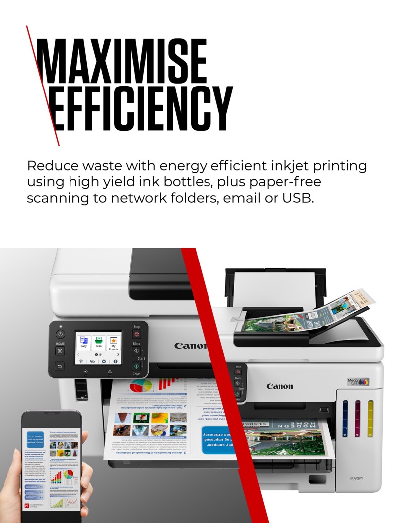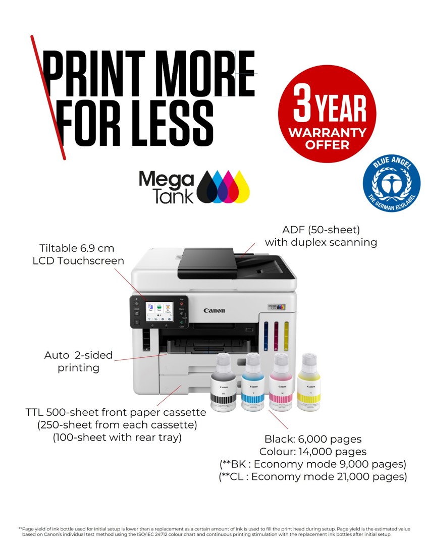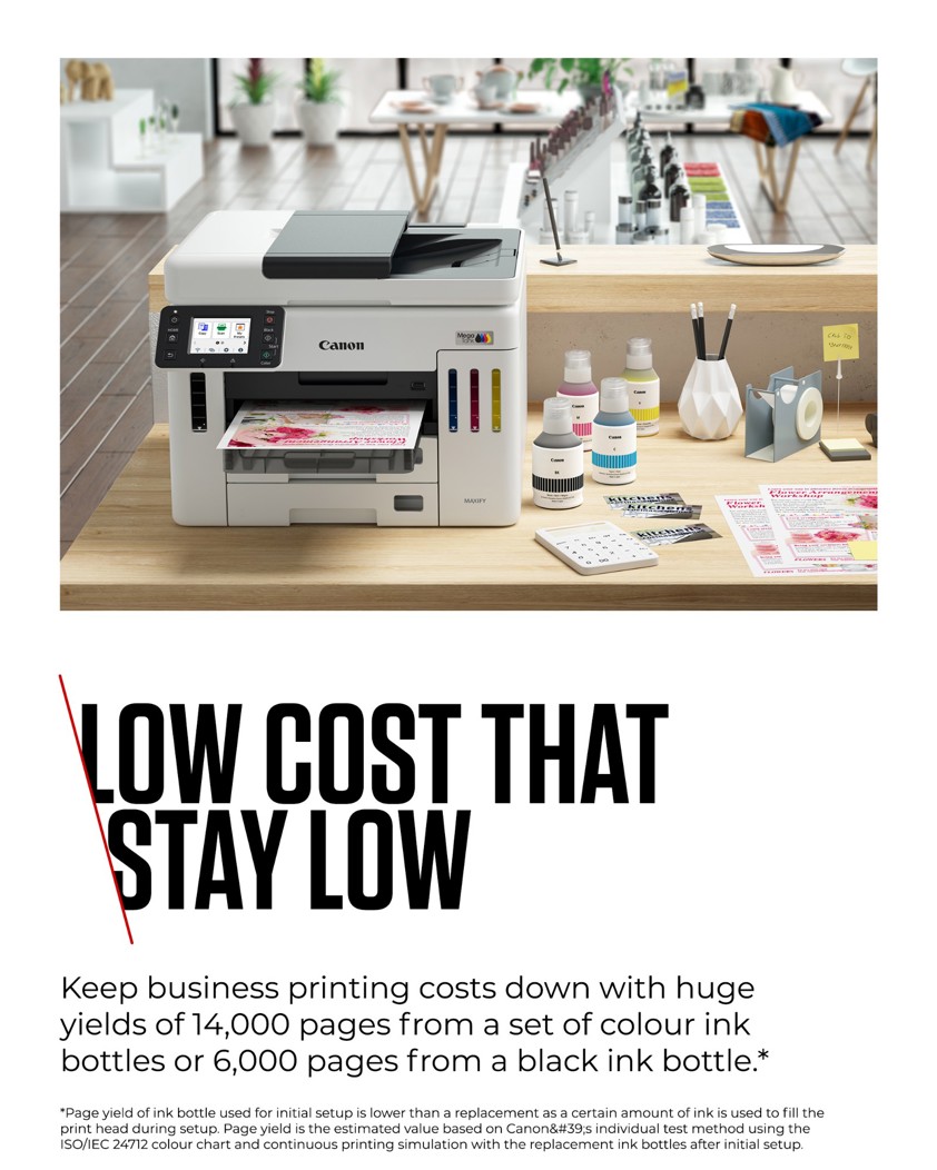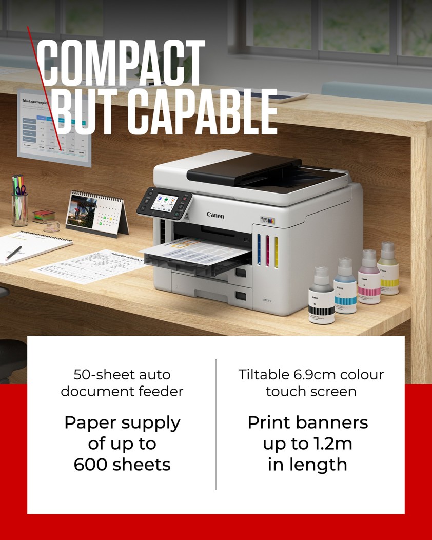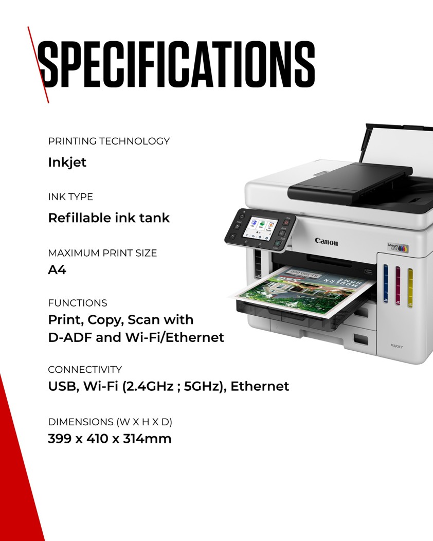 Features Product colour Black, White Scanning Colour scanning Faxing Colour faxing Duplex printing mode Auto Copying Colour copying Print technology Inkjet Printing Colour printing Control type Touch Market positioning Business Duplex printing Yes Duplex copying Yes Maximum duty cycle 45000 pages per month Duplex functions Copy, Print Printing colours Black, Cyan, Magenta, Yellow Ink tank system Yes Performance Scanning Colour scanning Faxing Colour faxing Maximum duty cycle 45000 pages per month Duplex functions Copy, Print Printing colours Black, Cyan, Magenta, Yellow Duplex printing mode Auto Copying Colour copying Product colour Black, White Print technology Inkjet Printing Colour printing Market positioning Business Print quality Scanning Colour scanning Faxing Colour faxing Maximum resolution 600 x 1200 DPI Maximum duty cycle 45000 pages per month Duplex functions Copy, Print Copying Colour copying Print technology Inkjet Printing Colour printing Input capacity Maximum input capacity 600 sheets Auto document feeder (ADF) input capacity 50 sheets Display Colour display Yes Display diagonal 6.86 cm (2.7") Display LCD Built-in display Yes Printing Print speed (ISO/IEC 24734) mono 24 ipm Print speed (ISO/IEC 24734) colour 15.5 ipm Maximum resolution 600 x 1200 DPI Duplex printing mode Auto Time to first page (colour, normal) 7 s Time to first page (black, normal) 5.5 s Print technology Inkjet Printing Colour printing Duplex printing Yes Copying N-in-1 copy function Yes ID-card copy function Yes N-in-1 copy function (N=) 2, 4 Maximum number of copies 99 copies Copying Colour copying Copier resize 25 - 400% Duplex copying Yes Scanning Scanning Colour scanning Optical scanning resolution 1200 x 1200 DPI Maximum scan area 216 x 356 mm Scanner type Flatbed & ADF scanner Output colour depth 8 bit Scan technology CIS Output greyscale depth 8 bit Fax Fax resolution (colour) 200 x 200 DPI Faxing Colour faxing Modem speed 33.6 Kbit/s Fax memory 250 pages Speed dialling Yes Input & output capacity Total number of input trays 3 Total input capacity 600 sheets Maximum input capacity 600 sheets Auto document feeder (ADF) input capacity 50 sheets Paper tray 1 input capacity 250 sheets Paper tray 2 input capacity 250 sheets Auto document feeder (ADF) Yes Print technology Printing colours Black, Cyan, Magenta, Yellow Paper handling Maximum ISO A-series paper size A4 ISO A-series sizes (A0...A9) A4, A5, A6 ISO B-series sizes (B0...B9) B5 Non-ISO print media sizes Legal, Letter Envelopes sizes Com-10, DL Photo paper sizes (imperial) 4x6,5x7,7x10,8x10 Custom media width 89 - 216 mm Custom media length 127 - 1200 mm Paper tray media types Envelopes, Matte paper, Photo paper, Plain paper Paper tray media weight 64 - 105 g/m² Ports & interfaces USB port Yes Direct printing Yes Network Ethernet LAN data rates 10,100 Mbit/s Mobile printing technologies Apple AirPrint, Canon iEasy-PhotoPrint, Mopria Print Service Wi-Fi standards 802.11a, 802.11b, 802.11g, Wi-Fi 4 (802.11n) Security algorithms WEP, WPA-PSK2 Wi-Fi Yes Ethernet LAN Yes Technical details Speed dialling Yes Product colour Black, White Energy Star Typical Electricity Consumption (TEC) 0.165 kWh/week Cartridge(s) included Yes Power consumption (copying) 21 W Duplex printing Yes Design Colour display Yes Display diagonal 6.86 cm (2.7") Display LCD Product colour Black, White Control type Touch Built-in display Yes Market positioning Business Power AC input voltage 100 - 240 V AC input frequency 50/60 Hz Power consumption (off) 0.06 W Energy Star Typical Electricity Consumption (TEC) 0.165 kWh/week Power consumption (copying) 21 W System requirements Windows operating systems supported Windows 10, Windows 7, Windows 8.1 Mac operating systems supported Mac OS X 10.12 Sierra, Mac OS X 10.13 High Sierra, Mac OS X 10.14 Mojave, Mac OS X 10.15 Catalina, Mac OS X 10.15.3 Catalina, Mac OS X 10.2 Jaguar, Mac OS X 10.3 Panther, Mac OS X 10.4 Tiger, Mac OS X 10.5 Leopard, Mac OS X 10.6 Snow Leopard, Mac OS X 10.7 Lion, Mac OS X 10.7.5 Lion, Mac OS X 10.8 Mountain Lion, Mac OS X 10.9 Mavericks, Mac OS X 11.0 Big Sur Server operating systems supported Windows Server 2008 R2, Windows Server 2012 R2, Windows Server 2016, Windows Server 2019 Other operating systems supported Android, ChromeOS, iOS, iPadOS Software Windows operating systems supported Windows 10, Windows 7, Windows 8.1 Mac operating systems supported Mac OS X 10.12 Sierra, Mac OS X 10.13 High Sierra, Mac OS X 10.14 Mojave, Mac OS X 10.15 Catalina, Mac OS X 10.15.3 Catalina, Mac OS X 10.2 Jaguar, Mac OS X 10.3 Panther, Mac OS X 10.4 Tiger, Mac OS X 10.5 Leopard, Mac OS X 10.6 Snow Leopard, Mac OS X 10.7 Lion, Mac OS X 10.7.5 Lion, Mac OS X 10.8 Mountain Lion, Mac OS X 10.9 Mavericks, Mac OS X 11.0 Big Sur Server operating systems supported Windows Server 2008 R2, Windows Server 2012 R2, Windows Server 2016, Windows Server 2019 Other operating systems supported Android, ChromeOS, iOS, iPadOS Operational conditions Operating temperature (T-T) 5 - 35 °C Operating relative humidity (H-H) 10 - 90% Weight & dimensions Width 399 mm Depth 410 mm Height 314 mm Weight 13.1 kg Packaging data Included cartridge capacity (black) 6000 pages Included cartridge capacity (CMY) 14000 pages Cartridge(s) included Yes Cables included AC Packaging content Included cartridge capacity (black) 6000 pages Included cartridge capacity (CMY) 14000 pages Cartridge(s) included Yes Cables included AC Included cartridge capacity (economy mode, black) 9000 pages Included cartridge capacity (economy mode, CMY) 21000 pages Other features Speed dialling Yes Energy Star Typical Electricity Consumption (TEC) 0.165 kWh/week Cartridge(s) included Yes Power consumption (copying) 21 W Control type Touch Duplex printing Yes Your parcel will arrive within 5 business days (excluding weekends and public holidays) after you place your order. Items are shipped in working days only, your order may arrive anytime between 7am and 9pm. Deliveries are not