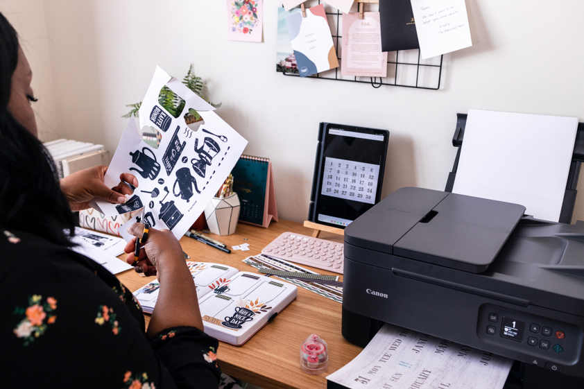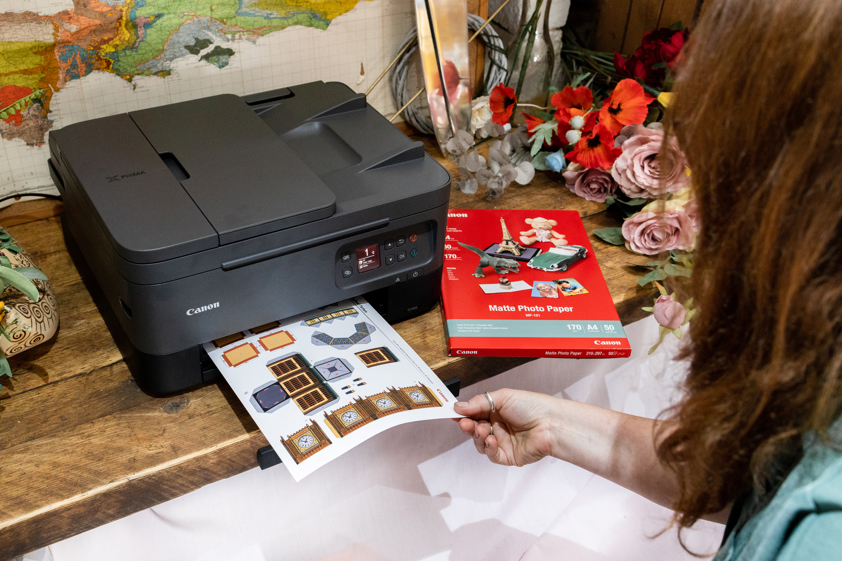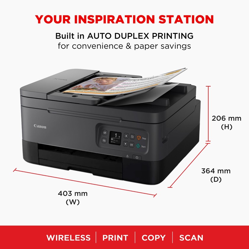 • The Canon PIXMA TS7450i is the perfect fit for versatile home use and effective home working: print, scan and copy from any device. It’s so easy to connect and operate using the Canon PRINT app: this all-in-one home printer offers mobile printing at its best. Stylish, affordable and simple to use, the PIXMA TS7450i offers the ability to print on many kinds of media from your computer, tablet or smartphone: print on photo paper, iron-on transfers, magnetic paper or restickable paper. With ADF technology, you can scan and copy multiple sheets in double-quick time, making home working faster and simpler. When work is over, the PIXMA TS7450i is as inventive as you are; it’s ideal for artistic endeavours with children, or even for the big kid in you. This printer is compatible with the PIXMA Print Plan, a monthly subscription for inks based on pages printed.