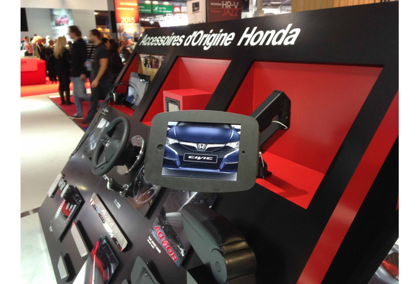The Space iPad Enclosure features rounded edges and open corners for improved ventilation and allows for limited access to buttons and inputs. Included is a removable home button cover to restrict access to the main button.