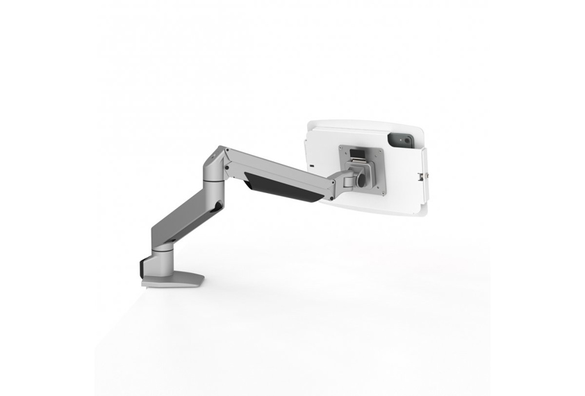 Our Reach Articulating Arm stand can be securely clamped on a desk or counter-top or to a wall (with additional bracket) for use as ergonomic desk companion. Allow your work space to “Reach new heights” with the Reach iPad Articulating desk mount. Tilt, swivel, extend and retract your iPad with a smooth gliding motion that can be easily adjusted to your liking.
