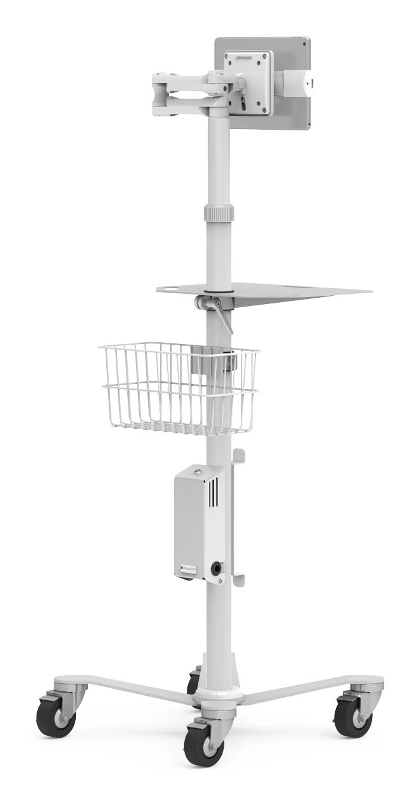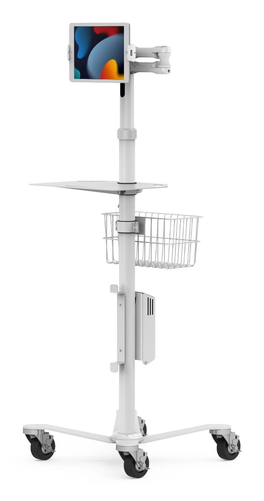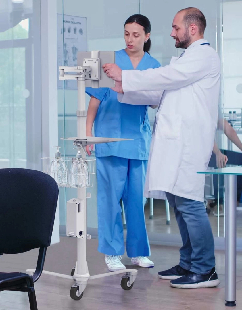 This is a versatile rolling workstation, perfect for integrating and deploying tablets/screens into a variety of mobile-connected environments:
