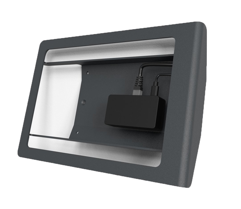 Easily mount iPad to mullions and drywall to create beautiful room scheduling displays. Install vertically or at a 15-degree upward angle. Multi Mount features a hidden pocket to hide and store power and networking adapters (sold separately)—while maintaining a slim profile. Multi Mount features rigid, commercial-grade construction, simple installation, and an attractive and durable powder coat finish. Modern Profile. Multi Mount for iPad creates a modern aesthetic outside of any meeting room. Optionally, Multi Mount can be installed with a 15 degree angle for comfort when mounted at an ADA-compliant height. Mount Left or Mount Right. With Multi Mount’s symmetric design you can mount to a mullion on the left or right side of the doorway. Its heavy steel construction creates an impressively rigid installation. Mount on Drywall. Multi Mount installs securely to drywall. Drywall anchors and mounting screws are included. Both landscape and portrait mounting is supported. Designed For 24/7 Use. Multi Mount’s open back maintains airflow to your iPad as it runs continuously at full screen brightness - to keep it running cool for years-on-end. All buttons remain accessible. Use iOS Guided Access feature to disable buttons from unwanted use. PoE Easy Power-over-Ethernet to your iPad devices need not be a hassle. With Multi Mount, you can tuck your favorite PoE Splitter in the rear pocket and access it quickly, without the need to disassemble the mount. Power + Data with Redpark Adapter Pair your Multi Mount with Redpark Gigabit + PoE Adapter (sold separately) to provide both power and data to your device. This MFI-certified (Apple approved) adapter will keep your tablet powered throughout the day, and provide a reliable Ethernet connection that supports speeds up to 225 Mbps. Supports Power Banks No way to run Ethernet cables to your mounted iPad ? No biggie. Multi Mount's rear pocket fits some of the most popular brands of power banks. Quickly swap power banks as needed. In the box Multi Mount for iPad 10.2-inch, Self-tapping mullion mounting hardware, Drywall mounting hardware, Assembly tool