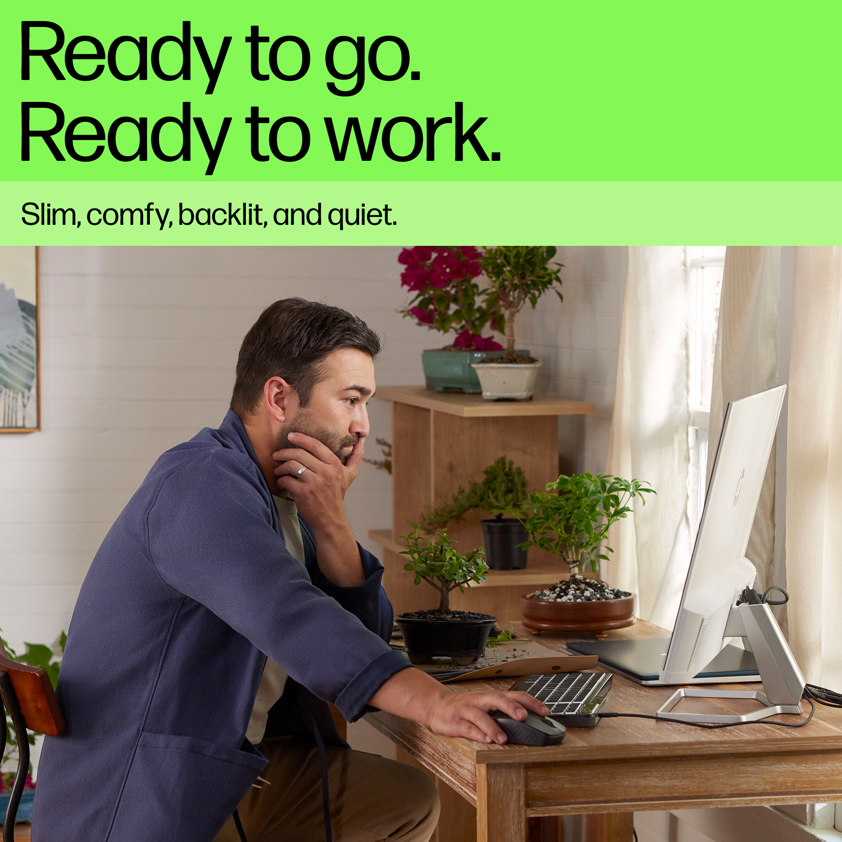 With warm white illuminated keys, this ready-to-go keyboard never misses a beat. Plug into your device and grind away with quiet keys and three levels of backlit LED glow. Plus, skyrocket your productivity with 12 programmable keys. Work and play all day on the slim and sanitizable[1] HP 405 Backlit Wired Keyboard.