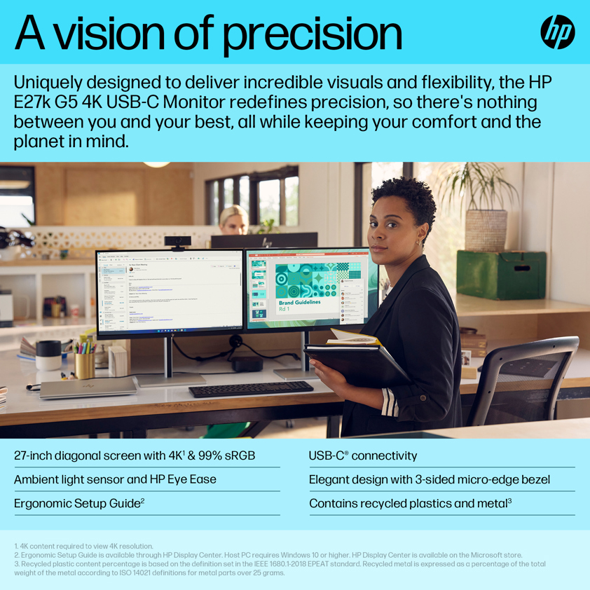 Uniquely designed to deliver incredible visuals and extended flexibility, the HP E27k G5 4K USB-C Monitor redefines precision, so there's nothing between you and your best. Stylishly crafted with your comfort and the planet in mind, this 4K display is a powerhouse of productivity.