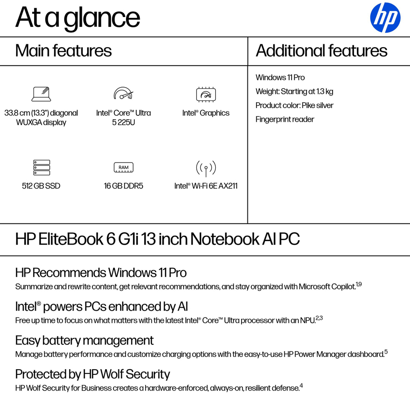 HP EliteBook 6 G1i 13 inch Notebook AI PC Laptop 512 GB SSD Wi-Fi 6E (802.11ax) Windows 11 Pro