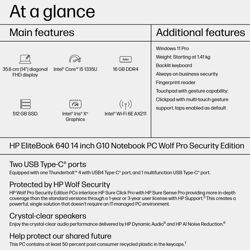 HP EliteBook 640 G10 Notebook - 177-degree hinge design - Intel Core i5 - 1335U / up to 4.6 GHz - Win 11 Pro - Intel Iris Xe Graphics - 16 GB RAM - 512 GB SSD NVMe - 14" IPS 1920 x 1080 (Full HD) - Gigabit Ethernet - NFC, Wi-Fi 6E - pike silver aluminium - kbd: UK - with HP Wolf Pro Security Edition (1 year)