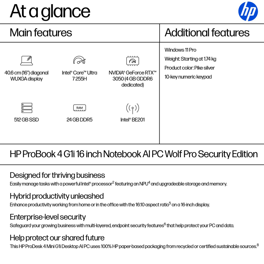• HP ProBook 4 G1i 16 inch Notebook AI PC Wolf Pro Security Edition Intel Core Ultra 7 255H Laptop 40.6 cm (16") WUXGA 24 GB DDR5-SDRAM 512 GB SSD Wi-Fi 7 (802.11be) Windows 11 Pro