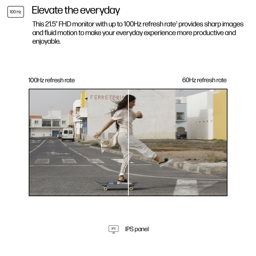 Make your everyday experience more productive and enjoyable with an expanded workspace for projects and assignments. This sleek 21.5" FHD monitor boasts a quality IPS screen that's visible from any angle and up to 100 Hz refresh rate[1] for sharp images and fluid motion.