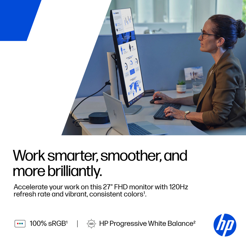 Stay focused and in your flow. The HP Series 5 Pro 27” FHD Monitor keeps you working productively and comfortably. See your work come to life seamlessly and lightning-fast, with clear details and consistent colors. All built into a sleek, modern design.