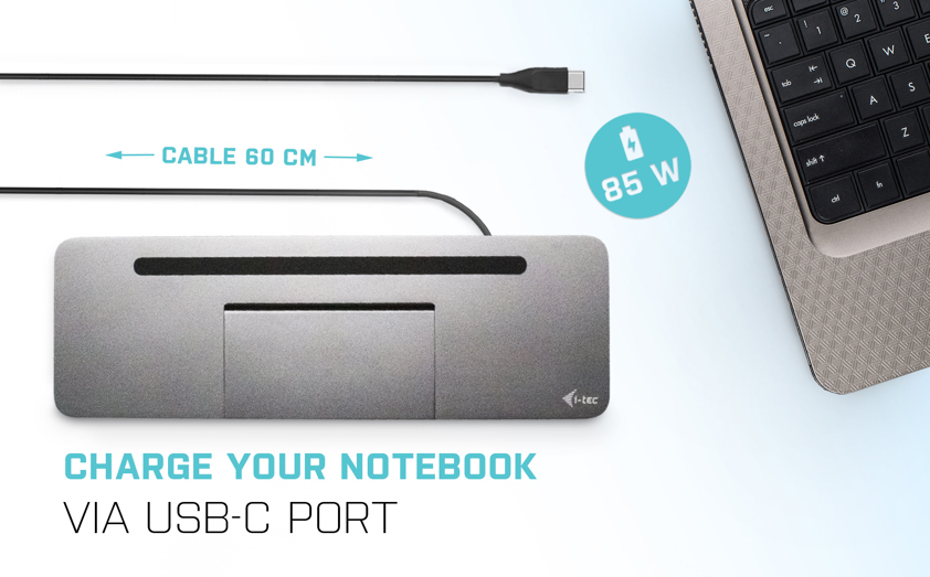 • Ergonomic metal USB-C docking station with support for up to 3 external monitors. The station is compatible with any laptop equipped with a USB-C or Thunderbolt 3 port (the 60 cm integrated cable is long enough to connect all laptops with screens up to size 15“). The dock provides 4x USB ports, reliable and quick connection to company networks thanks to an integrated LAN port and up to 85 W power delivery. The station’s design also allows it to be used as a stand for a laptop.