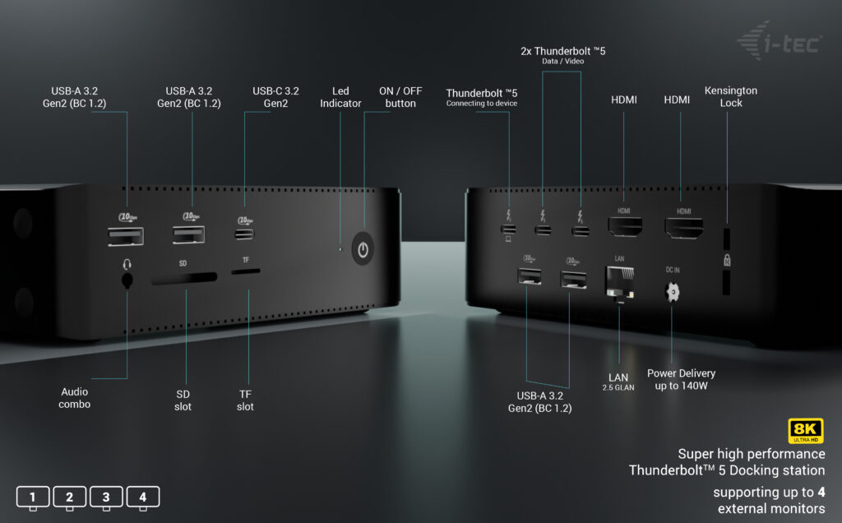 i-tec Thunderbolt5 Quattro Display Docking Station, 5x USB, 2.5 GLAN + Power Delivery 140W