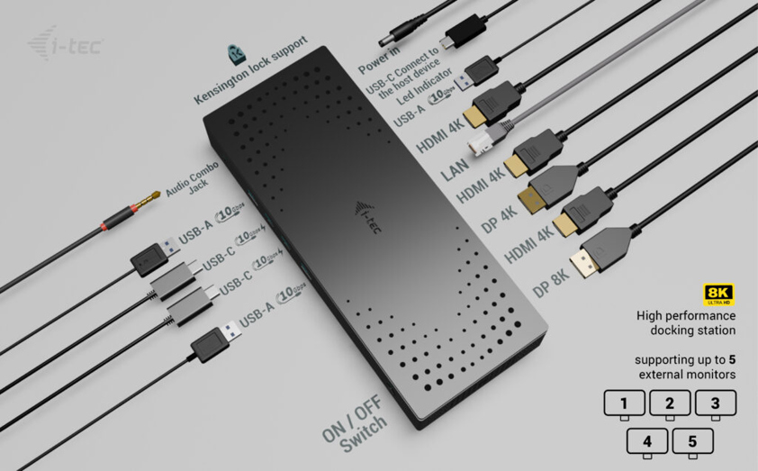 The highest performance docking station possible! Supports up to five external monitors* with 4K/60Hz resolution. And one monitor can even run at 8K/60Hz! The ideal dock product for users who require multiple monitors without compromising on image stability, resolution and refresh rate. The dock also features two USB-C fast charging ports (with up to 15W charging power), especially for charging smartphones and tablets, as well as fast USB ports, a 2.5Gbps LAN port, and other peripherals.
