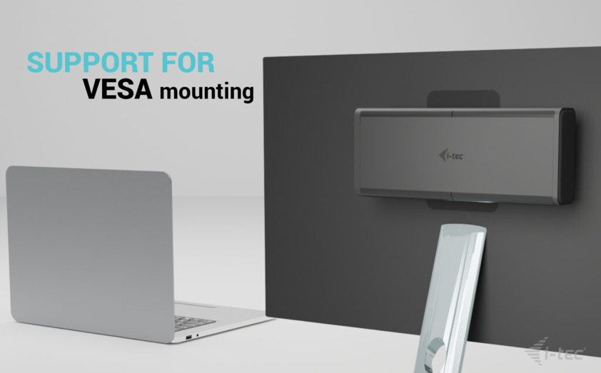 The dock can be installed behind the monitor (if it supports a standard VESA mount), using the i-tec VESA mount.