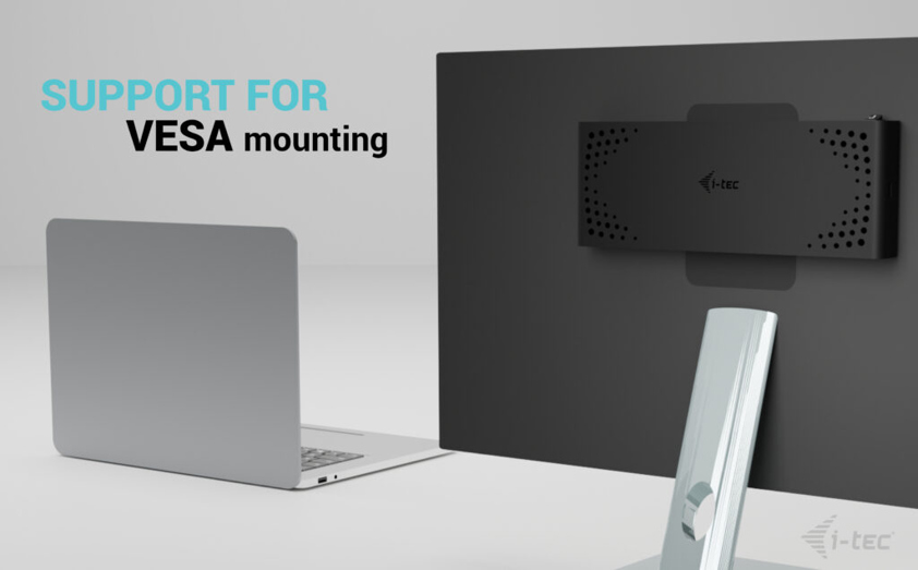 - Docking station supports a VESA mount for smart vertical installation behind a VESA-enabled monitor
