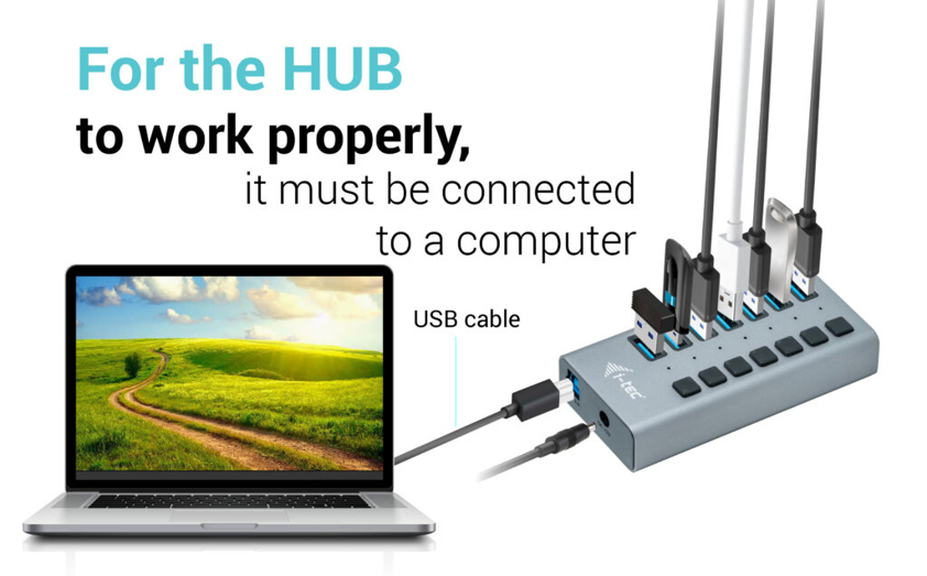 This HUB offers seven USB 3.0 ports with the Plug & Play function and with standard USB charging – the HUB automatically detects whether a device for USB charging is connected. As this HUB is equipped with seven USB 3.0 ports, it can charge up to seven devices at a time. The USB 3.0 interface is especially important for data transfers from USB 3.0 memory cards and flash drives, where its high transfer rate is most useful. An external power adapter is included in the package to guarantee stable HUB performance and charging from the USB ports, providing up to 10 W of charging power for each port.
