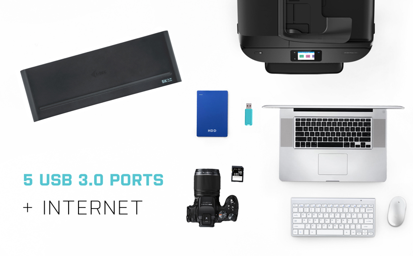 Printer? Keyboard? Mouse? External hard drive or flash drive? Charging cable for your phone? You can connect all your devices to the docking station quickly and easily. In addition, you can connect to the Internet thanks a LAN port, eliminating any worries with variable speed and quality of Wi-Fi networks.