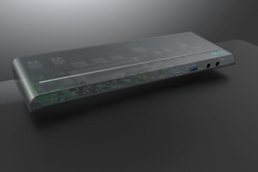 The docking station also offers audio input/output, a gigabit network card, five USB 3.0 ports (incl. one with Fast Charge BC 1.2 support), one USB-C data port and ON / OFF switch.