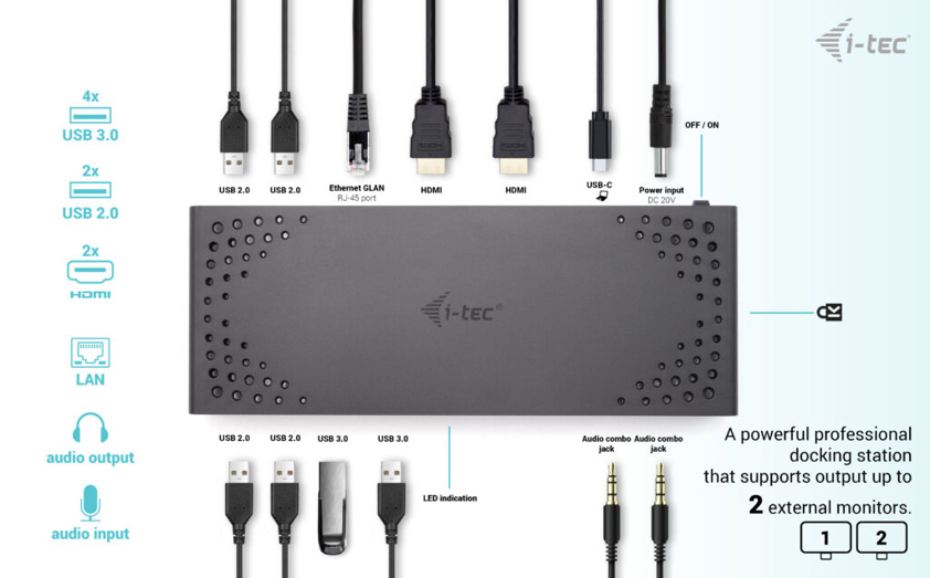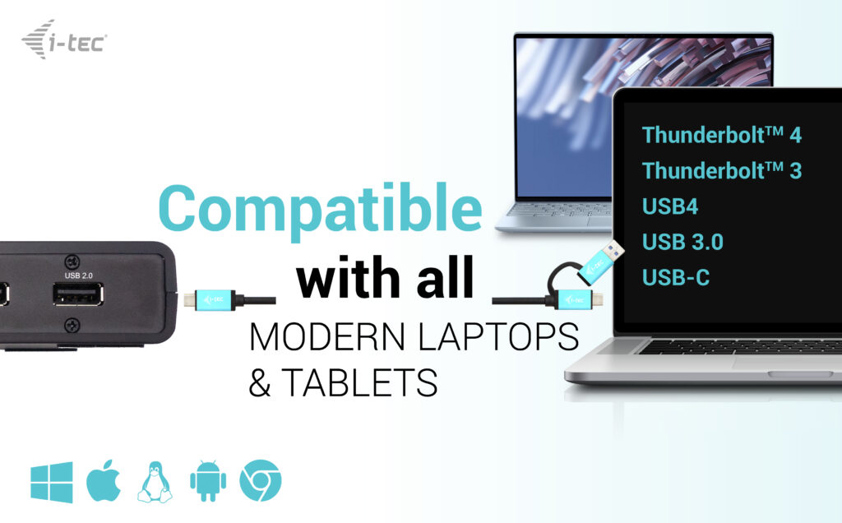 i-tec docking stations are compatible with the vast majority of notebook brands and platforms, making it easier than ever to connect your favourite hardware. The unit is extremely compact, perfect for use at home or in the office. Due to the hybrid interface option especially hot desk use, due to the USB-C or USB-A interface options.