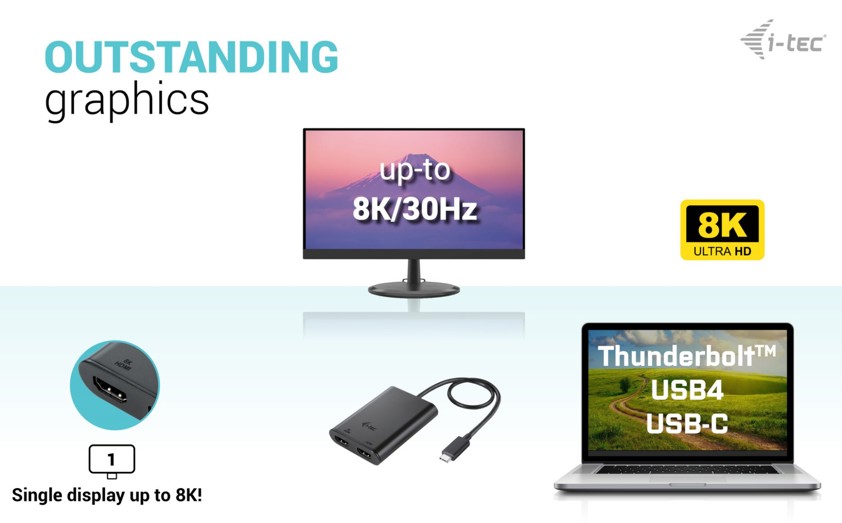 Expand your desktop to two external HDMI monitors or connect projectors or television to your notebook, tablet or PC via new USB-C or Thunderbolt 3 connector. The adapter supports 1x 8K / 30 Hz or 2x 4K / 60 Hz*.