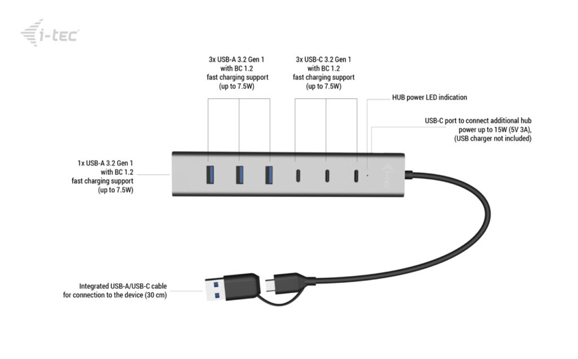• i-tec USB-C/USB-A Charging Metal HUB 7 port (3x USB-C, 4x USB-A)