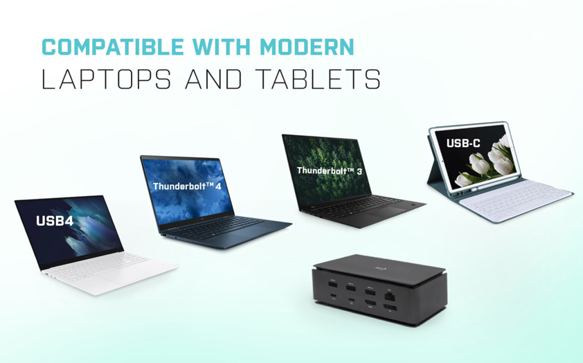 Since USB4 technology is backwards compatible, you can connect this dock not only to laptops and tablets with USB4, but also ThunderboltTM 3/4 and USB-C (must support video transfer). This makes the dock an ideal and flexible solution for businesses and users who run laptops and tablets with different ports.