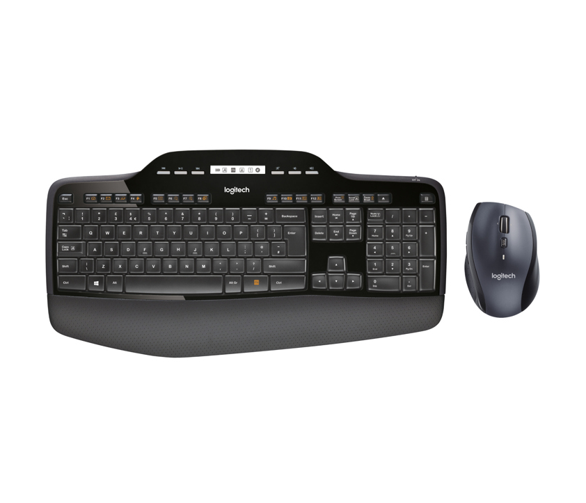 • The Logitech® Wireless Desktop MK710. Where comfort and productivity go hand-in-hand. This low-profile keyboard features concave Logitech Incurve keys™ that position your fingers properly, and their softly rounded edges invite your fingertips to glide from key to key. Up to three-year battery life for both keyboard and mouse practically eliminates the need to replace batteries.* Hyper-fast scrolling lets you fly through long documents, or shift to precise click-to-click scrolling. An LCD dashboard lets you know—for example—that Caps Lock is on, before you type an entire page. And the tiny Logitech Unifying receiver stays in your laptop and lets you connect another compatible wireless mouse or number pad.