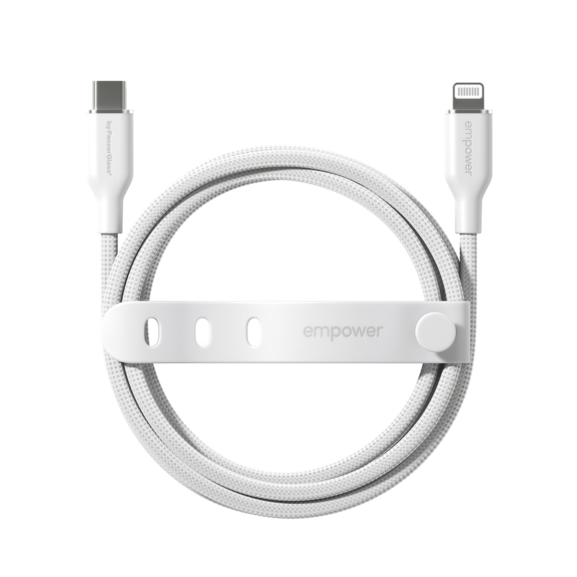 The empower by PanzerGlass® Racing USB-C to Lightning Cable features an ultra-soft and durable silicon interior paired with a braided outer cable sheath for durability and a premium feel. Convenience is key. Keep the cable organized when not in use with a handy strap. And the best part? It's made from 100% post-consumer recycled (PCR) materials.