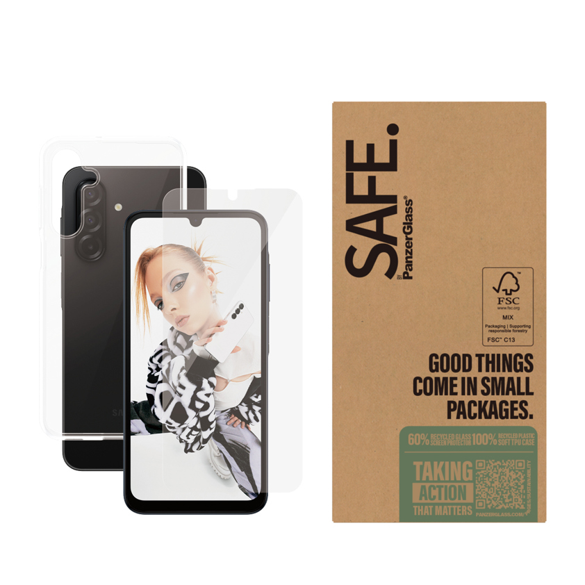 Be super fresh. Be superfly. Be super SAFE. When life is tough (and pavements too), this 2-in-1 protection combo from SAFE. by PanzerGlass® comes to the rescue. The combo features a screen protector made of 60% recycled material and a soft, transparent TPU case made of 100% recycled plastic, keeping your precious phone SAFE. from pocket plunges, dance floor mishaps, selfies gone wrong, and your everyday fumbling, dropping and screen cracking.