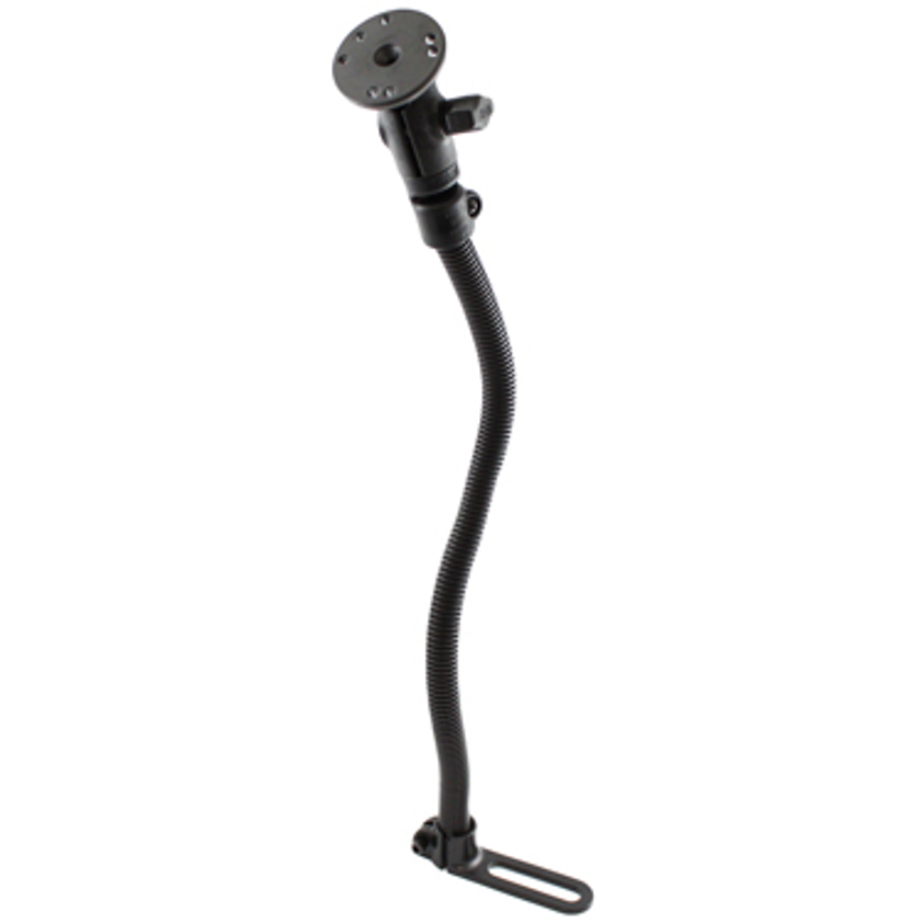 The RAM-B-316-1-202U consists of the RAM POD I universal No-Drill vehicle base, 18" rigid aluminum rod, single B Size 1" ball socket arm and round base plate. The base of the mount connects to your seat rail without any drilling necessary. The 18" rigid aluminum rod can be bent to position your device to its optimum viewing location. The 2.5" diameter round base adapter contains the universal AMPS hole pattern. For proper fit, make sure your vehicle has an appropriate bolt to mount the base securely. The RAM-B-316-1-202U will not work with 2014 and newer Chevrolet seats that have the seat hook system.