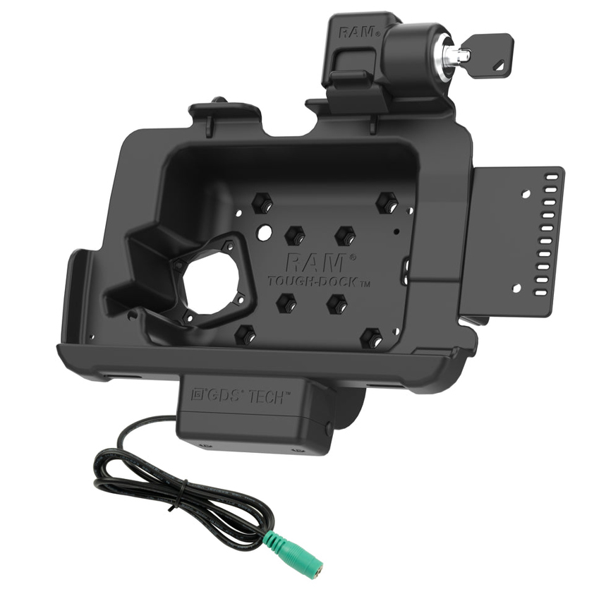 • Featuring charging capabilities and a key lock for theft deterrence, the RAM® Tough-Dock™ for Zebra ET40 & ET45 8" enterprise tablets with Rugged Frame allows you to keep the device charged through the pogo pin contacts when the device is docked—power is provided by connecting to the dock's 5.5mm DC power jack. The dock also allows the tablet's scanning function to work on the side, as well as tablet add-ons such as the Zebra Expansion Back and PowerPack Battery. This vehicle dock is compatible with C and D size RAM® 4-hole AMPS and 75mm x 75mm VESA pattern bases for attaching a double socket arm in order to complete your mounting solution. Take the solution a step further by taking advantage of the built-in 2-hole mounting plate compatible with RAM® 2-hole diamond base for additional device mounting such as a phone or other handheld device.