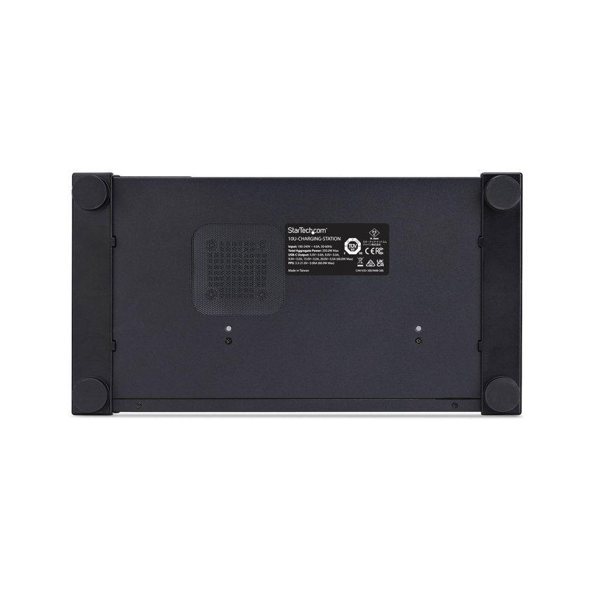 Designed for flexibility, the hub includes rack-mounting ears for 19-inch server racks as well as rubber-gripped feet for secure desktop use. Its stackable design allows multiple units to be layered neatly, expanding charging capacity without adding clutter.