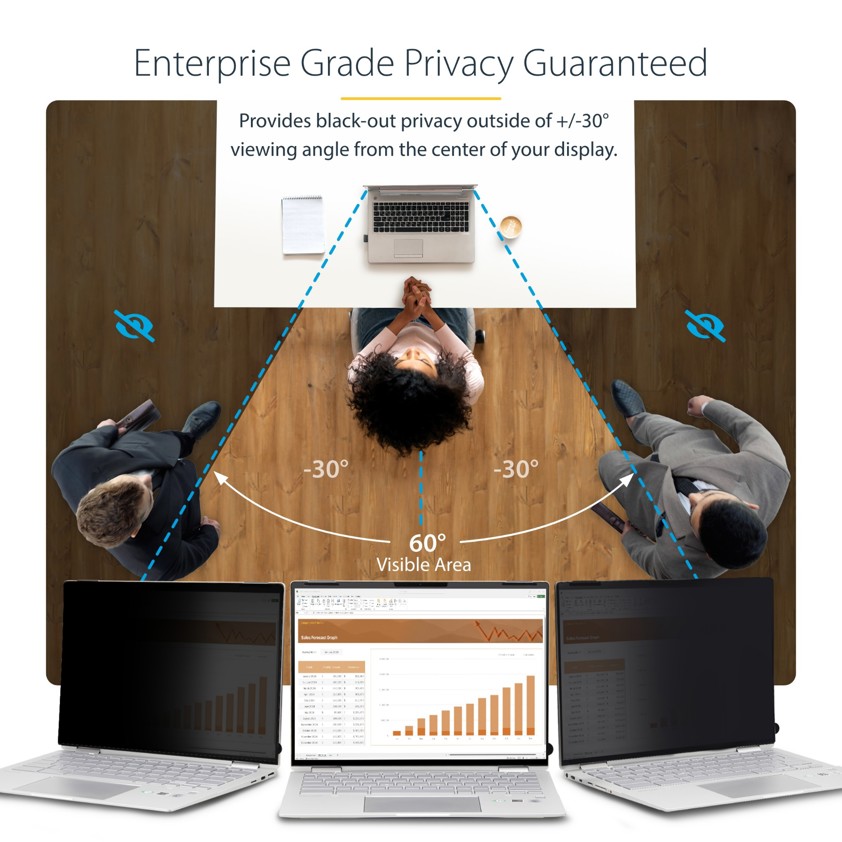 This privacy filter is a convenient and cost-effective solution to protect confidential data from unwanted viewers. The privacy shield darkens your computer's screen from the side while providing a clear viewing angle of 60 degrees (+/- 30 degrees from center) to the user.