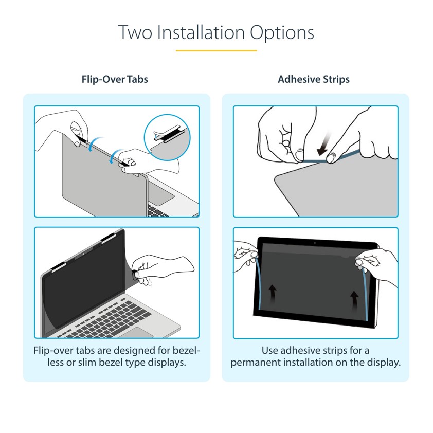 Install the privacy screen protector using the included adhesive strips or flip-over tabs. This unit is designed for use with bezel-less or slim bezel displays.