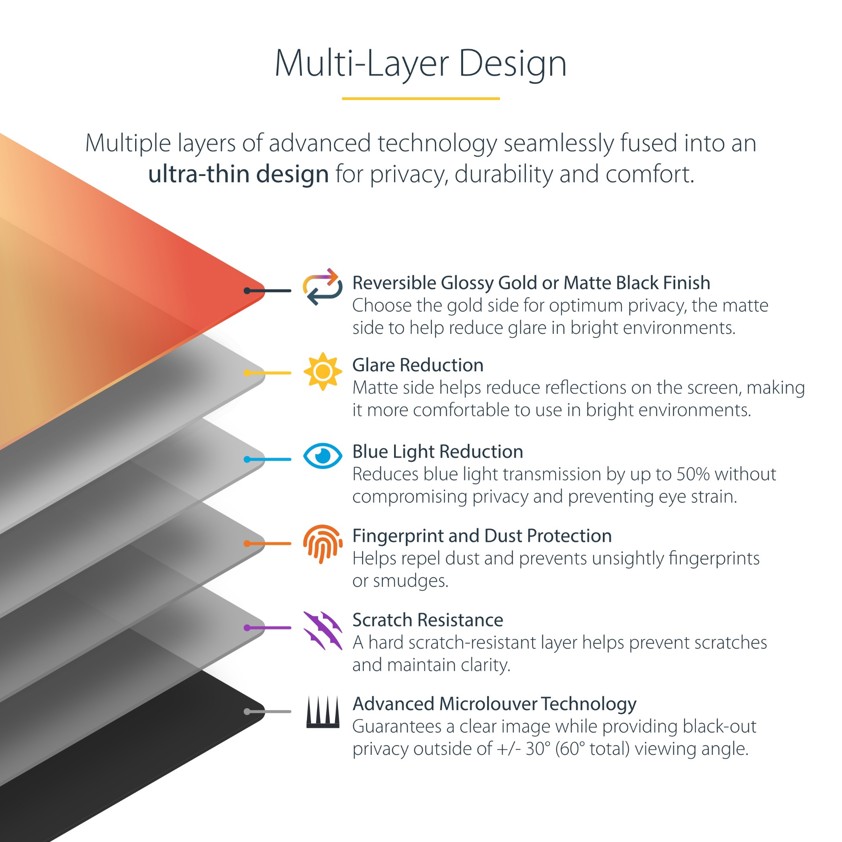 The privacy filter's removable and reversible design allows users to effortlessly switch between a glossy gold side for maximum privacy and an anti-glare matte side for environments prone to glare. The matte side provides additional screen protection with a scratch- and fingerprint-resistant coating.