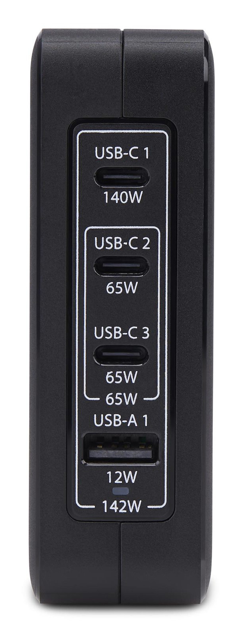 Performance USB 3.2 Gen 1 (3.1 Gen 1) Type-A ports quantity 1 Charger type Indoor Charger compatibility Universal Power source type AC Power protection features Over current, Over voltage, Overheating Fast charging Yes Fast charging technology Power Delivery 3.1 USB Type-C ports quantity 3 USB Power Delivery (USB PD) Yes USB Power Delivery revision 3.1 Programmable power supply (PPS) Yes Number of simultaneously connected devices (max) 4 Design Product colour Black Gallium nitride (GaN) transistors Yes Housing material Plastic Power Port 2 output current 3.25 A Port 1 output current 5 A Input current 2.2 A Maximum power 142 W Input voltage 100 - 240 V Input frequency 50 - 60 Hz Maximum output voltage 28 V Minimum output voltage 5 V Port 3 output current 3.25 A Port 1 output power 140 W Port 2 output power 65 W Port 3 output power 65 W Port 4 output power 12 W Port 4 output current 2.4 A Technical details Charger type Indoor Charger compatibility Universal Power source type AC Power protection features Over current, Over voltage, Overheating Manual Yes Compliance certificates UL Weight & dimensions Width 76 mm Depth 96 mm Height 31 mm Weight 358 g Package width 170 mm Package depth 142 mm Package height 35 mm Package weight 500 g Packaging data Included power plug types AU, EU, NA, UK Package width 170 mm Package depth 142 mm Package height 35 mm Package weight 500 g Operational conditions Storage temperature (T-T) -20 - 80 °C Storage relative humidity (H-H) 10 - 90% Operating temperature (T-T) 0 - 25 °C Operating relative humidity (H-H) 10 - 90% Packaging content Included power plug types AU, EU, NA, UK Manual Yes Certificates Compliance certificates UL Colour Product colour Black Logistics data Products per master (outer) case 10 pc(s) Master (outer) case width 360 mm Master (outer) case length 195 mm Master (outer) case height 165 mm Other features Manual Yes Your parcel will arrive within 5 business days (excluding weekends and public holidays) after you place your order. Items are shipped in working days only, your order may arrive anytime between 7am and 9pm. Deliveries are not made on public holidays, so you can expect your order to arrive the next working day.