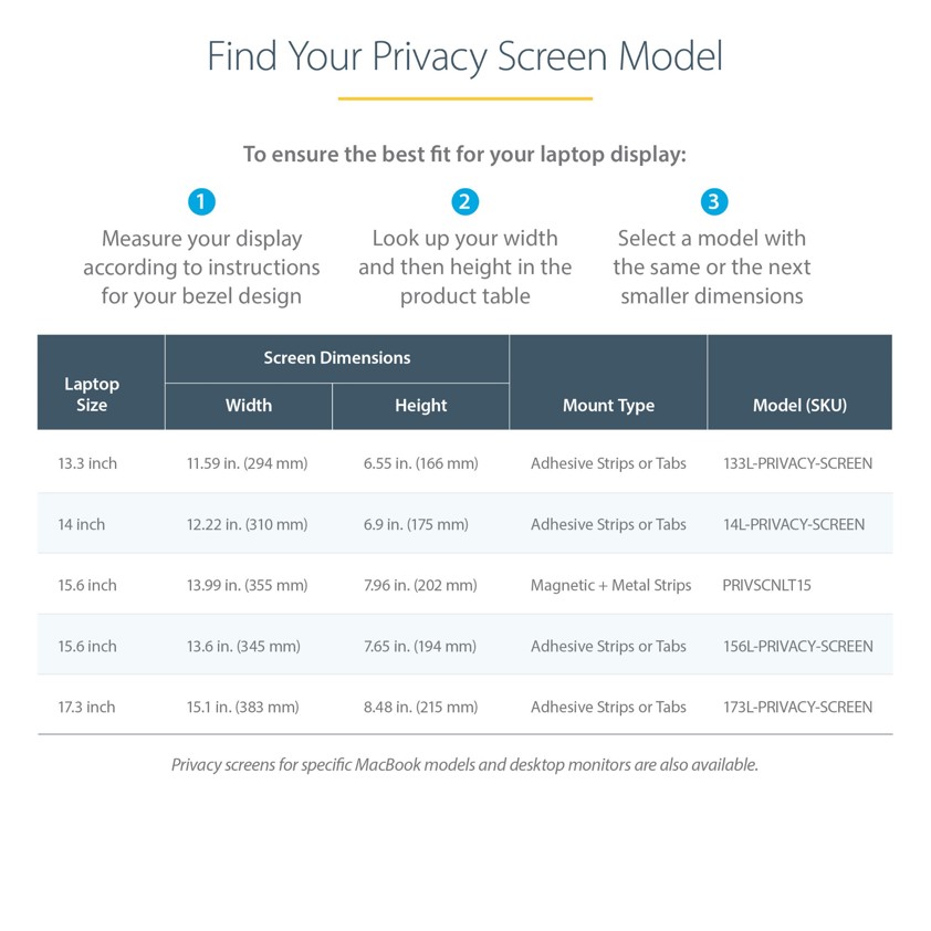 The universal design won't interfere with top-mounted webcams, sensors, or when closing the lid. The privacy filter can be installed in two different ways. Affix the privacy shield to bezel-less displays using the transparent and residue-free adhesive strips. Alternatively, use the slide mount tabs to install the privacy screen on displays with bezels. The latter is recommended when frequent reversal or removal is required.