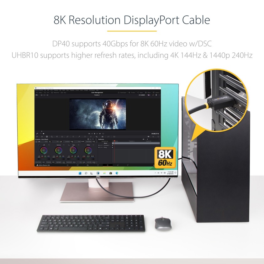 Connect an 8K/4K UHD DisplayPort monitor to a host computer or MST hub, using this VESA-Certified DisplayPort 2.1 DP40 Cable. This cable facilitates high bandwidth video and multi-channel audio and is ideal for 8K workstations, high performance GPUs, and dedicated AV applications including media production and content creation.