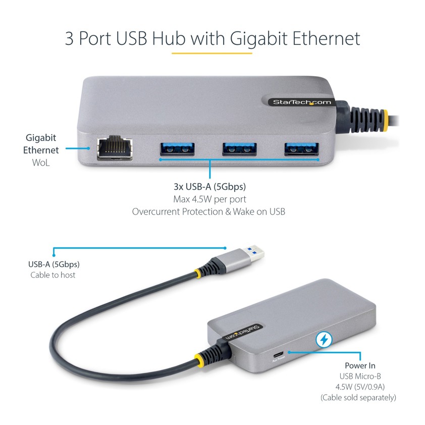 StarTech.com 3-Port USB Hub with Ethernet - 3x USB-A Ports - Gigabit Ethernet (RJ-45) - USB 3.0 5Gbps - Bus-Powered - 1ft/30cm Long Cable - Portable Laptop USB Hub Adapter w/ GbE