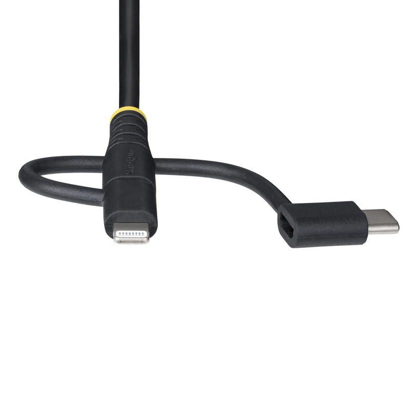 Connect to an Apple Lightning, USB-C, or Micro-USB device using this Rugged 3-in-1 Cable designed for frequent use