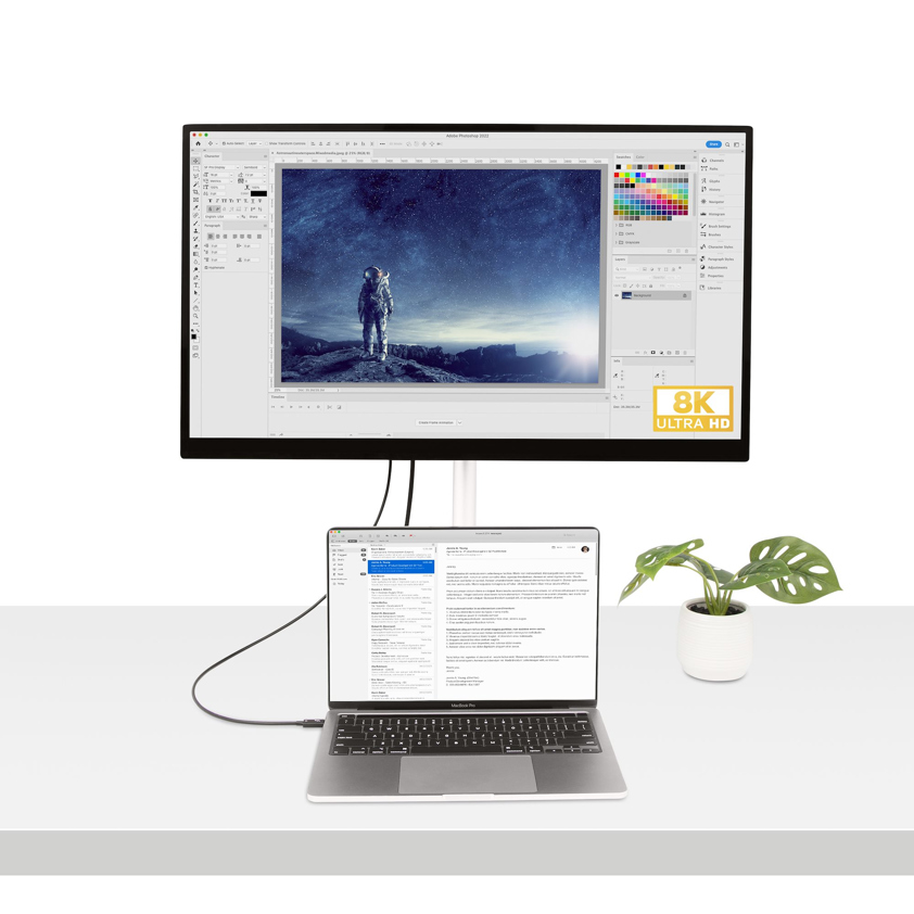 The cable supports full-8K 60Hz video and DisplayPort 1.4a, and is compatible with DisplayPort displays. Use it to connect a docking station to laptop, or a laptop to a display
