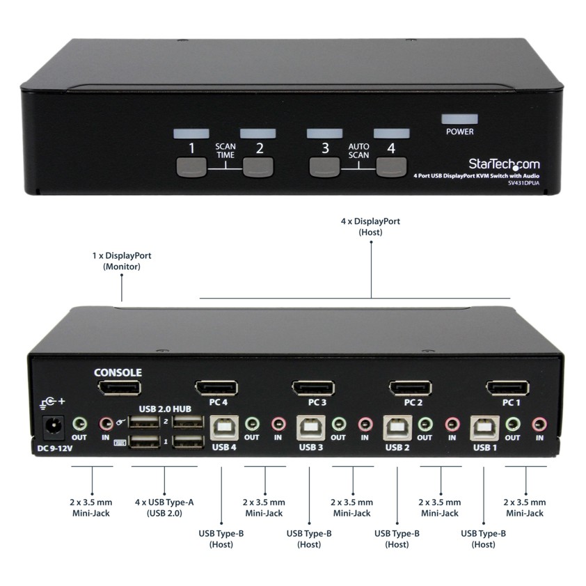 StarTech.com 4 Port DisplayPort KVM Switch - 4K 60Hz - Single Display - Dual Port UHD DP 1.2 USB KVM Switch with Integrated USB 2.0 Hub & Audio - Dell, HP, Apple, Lenovo - TAA Compliant