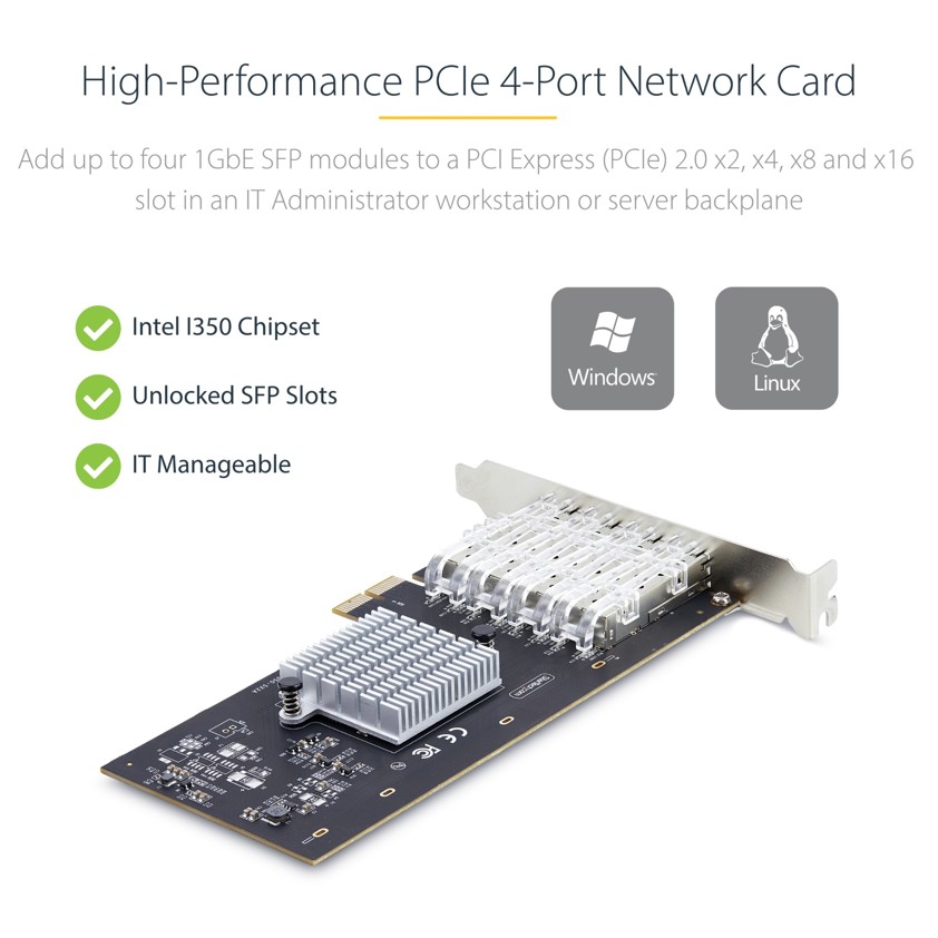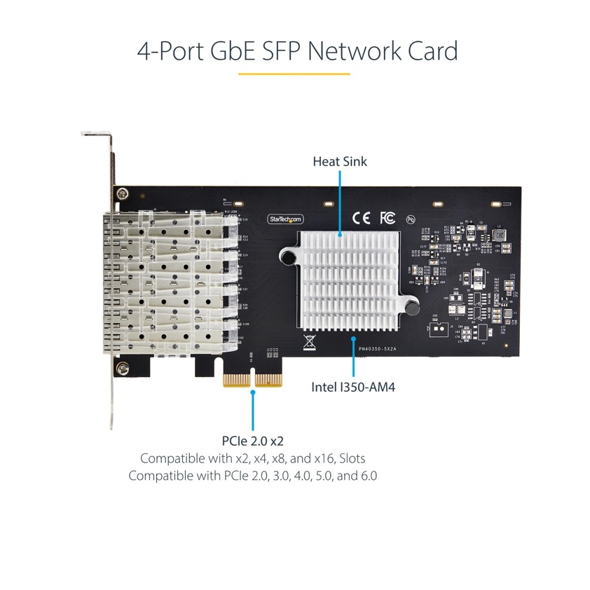 StarTech.com 4-Port GbE SFP Network Card, PCIe 2.0 x2 (x4, x8, x16 Compatible), Intel I350-AM4 4x 1GbE Controller, 1000BASE Copper/Fiber Optic, Desktop/Server Quad-Port Gigabit Ethernet NIC - Windows & Linux