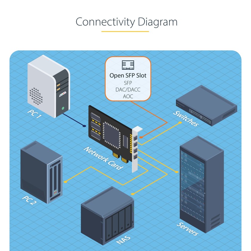 The network interface controller connects to an available x2 PCI Express 2.0 (or higher) expansion slot. It is compatible with Windows Server 2012 and newer, Windows 10 and newer, Linux, VMware ESXi 7.x, and Microsoft Hyper-V. This NIC is compatible with both MSA-compliant and branded 1GB SFP modules, as well as direct attach copper cables (DACC).
