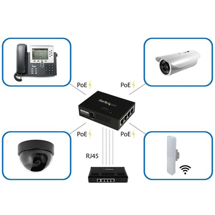 It supplies up to 30 Watts output to each port, so you can easily power and access up to four high-power PoE-compliant devices — such as IP cameras — using standard Ethernet cable.